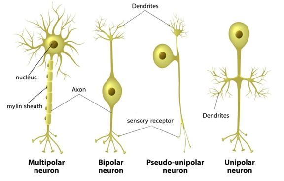 (1) 단극성(unipolar) 뉴런: 한 개의 신경돌기(축삭과 수상돌기)를 가진 뉴런