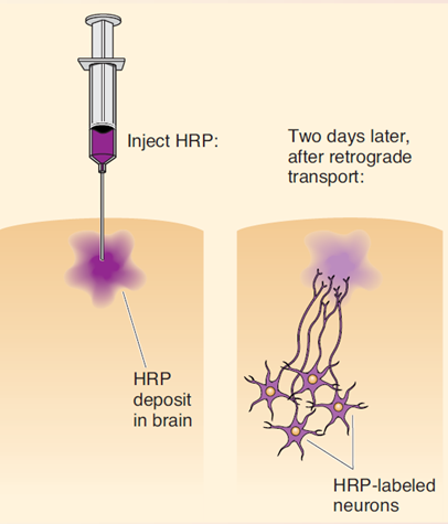 - 역방향 수송은 horseradish peroxidase(HRP)를 이용해서 관찰할 수 있음 (HRP는 역수송되는 효소 중 하나, 구강 타입의 헤르페스 바이러스도 입술과 입에 있는 축삭말단에 들어와서 세포몸체로 역수송되어 감염을 일으킴)