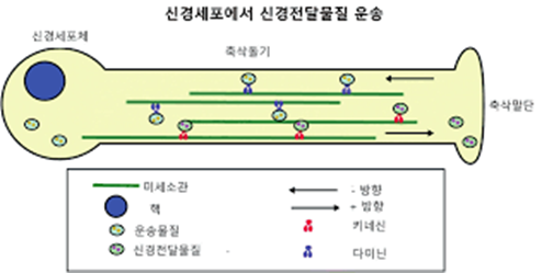 - 정방향 운반(anterograde transport): 세포체에서 말단 방향으로 이동, 키네신(kinesin)이라는 수송 단백질에 의해 수송되고, ATP가 에너지를 제공